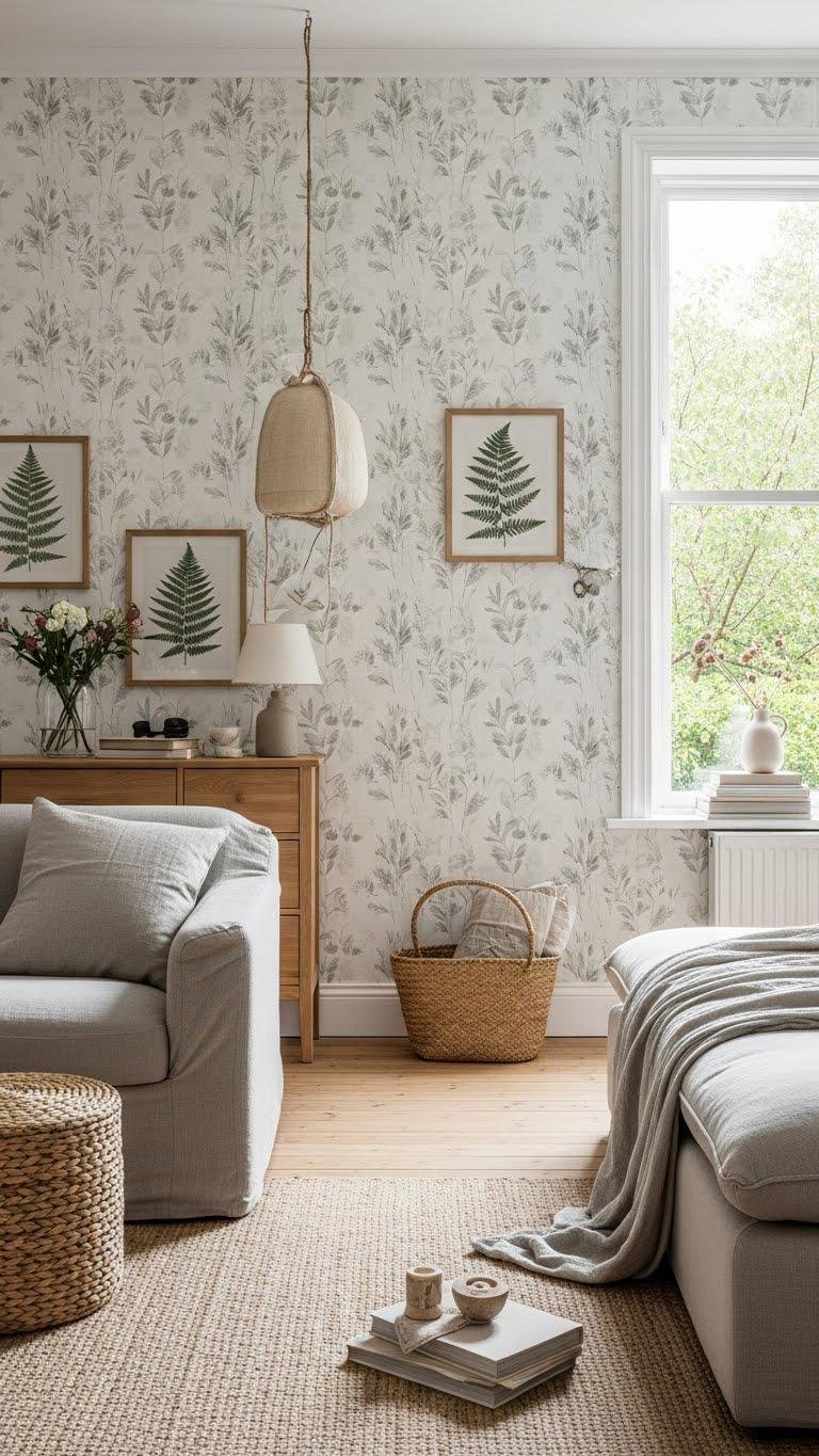 A whisper of foliage can shift a room from plain to peaceful: choose a subtle botanical wallpaper with small-scale leaves, soft line work, or muted watercolors so the pattern reads calm from across the room but rewards a closer look.