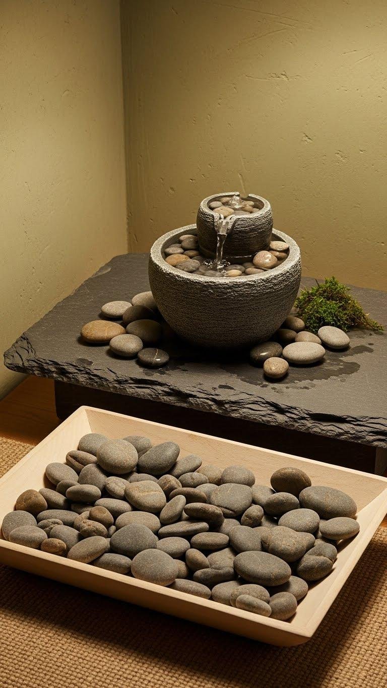 Bring the calm of foliage down to earth by introducing pebble, stone, and water details that echo the wallpaper’s quiet rhythm. Scatter river pebbles in a shallow tray, place a coastal slate bedside slab, and add a small tabletop fountain for soft motion.