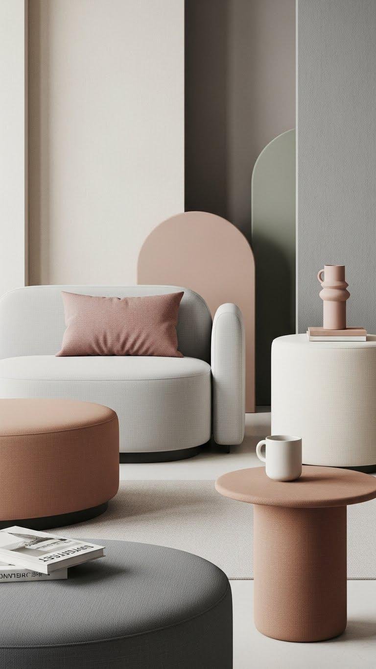 Choose a muted earthy palette to ground the room—soft clay, warm taupe, olive-gray, and sun-bleached sand will calm the eye and make curved forms feel even more inviting. You’ll pick muted ochre accents and clay taupe walls to create calm contrast, keep furniture simple, and let natural light read the tones.