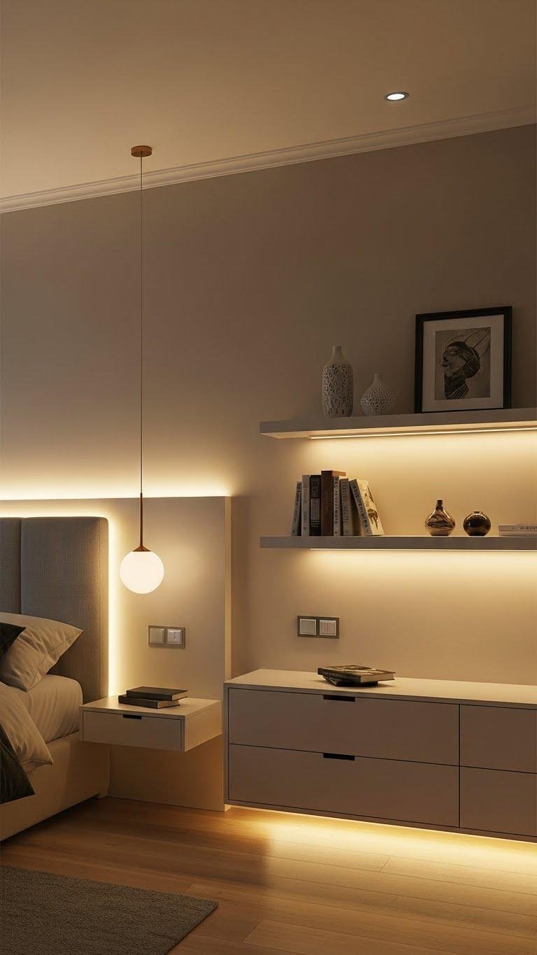 Because you want a bedroom that feels calm and layered, hidden and indirect lighting lets you sculpt mood without glare. Use recessed cove strips for soft perimeter wash, indirect uplighting behind headboards to lift the ceiling, toe kick glow under dressers for an effortless night path, and floating shelflight to showcase objects.