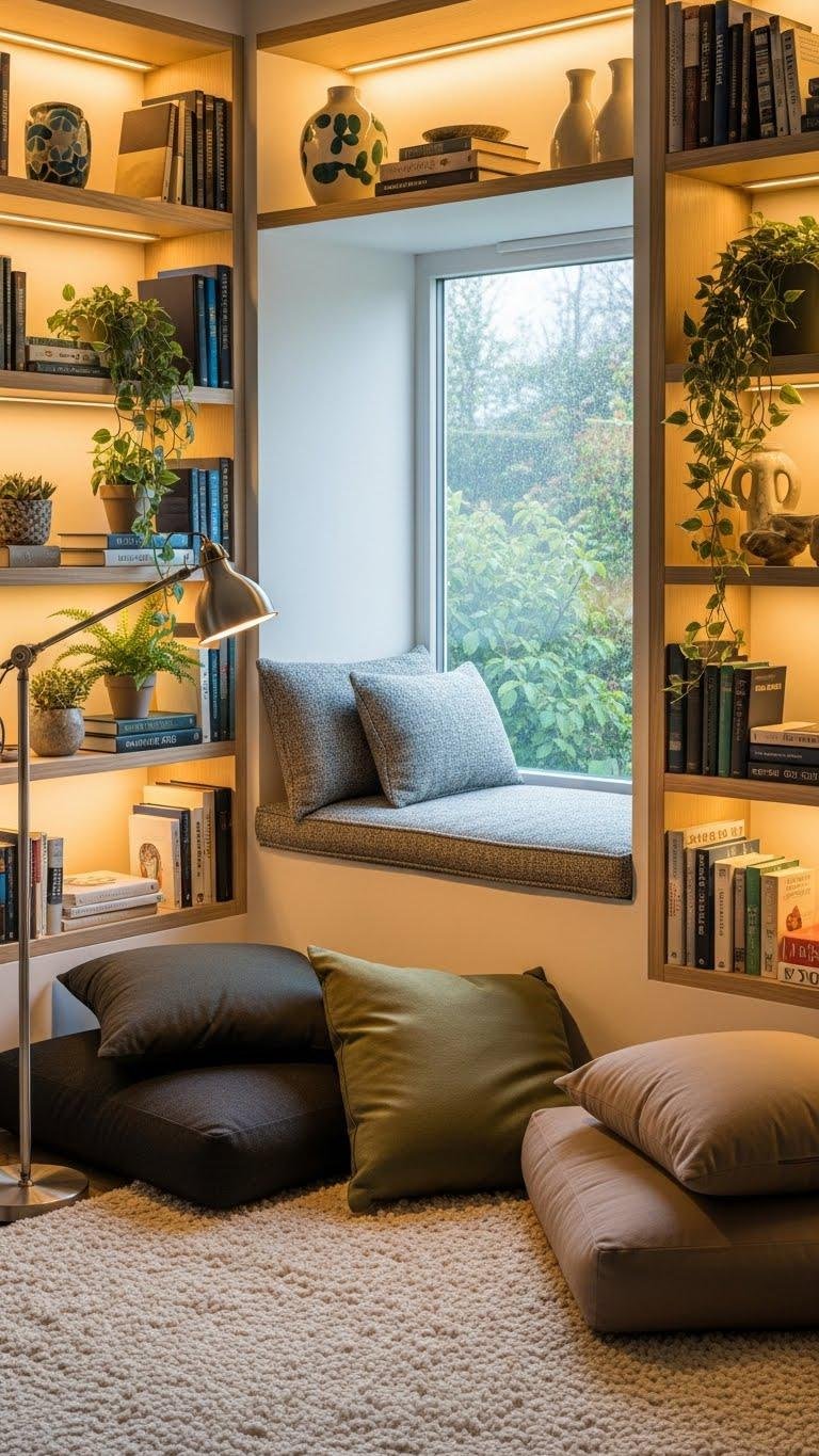 Claim a window alcove, add low floor cushions, float ambient shelving for books and plants, and position an adjustable lamp for focused reading.
