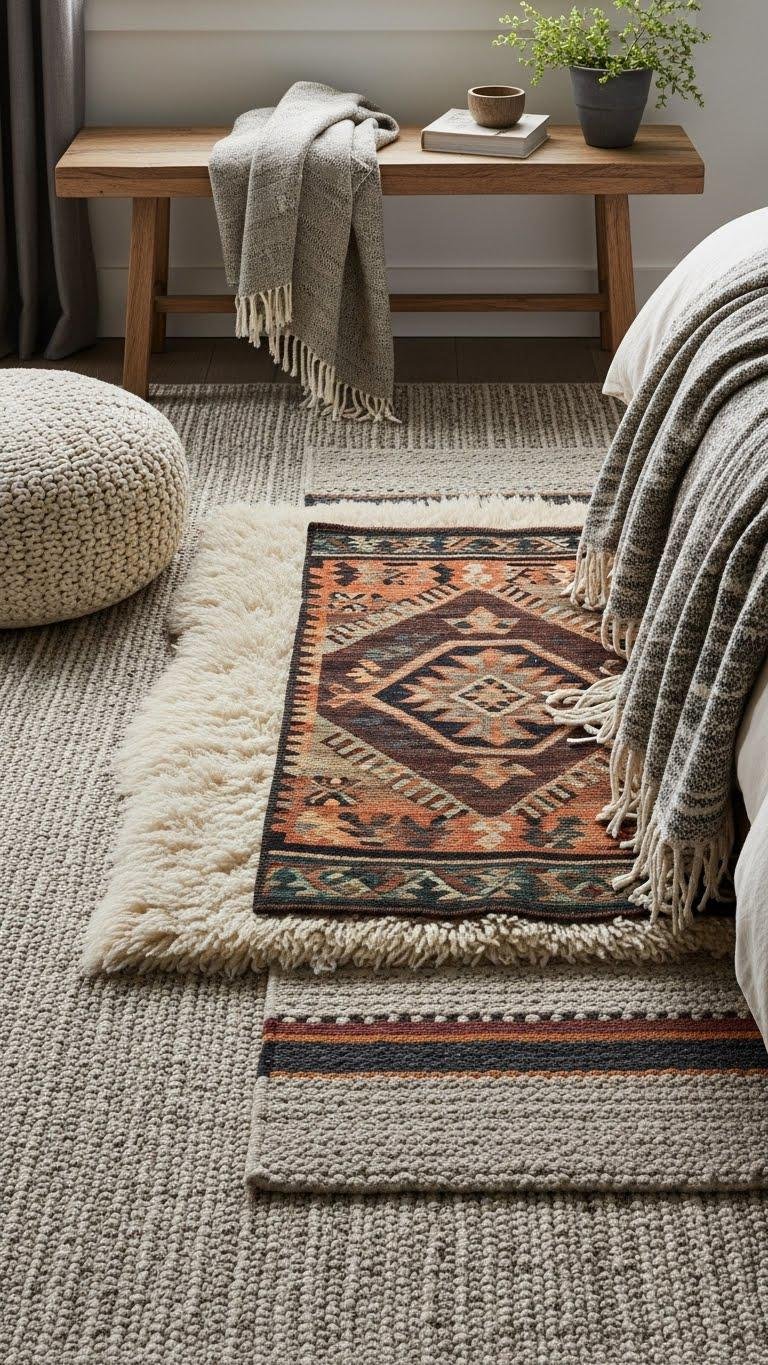 Layer rugs and throws to bring instant warmth and texture underfoot — start with a neutral flatweave as your base, then add a plush wool or shag for softness and a patterned kilim or vintage runner for visual interest. You’ll mix layered textures and tactile contrast, draping throws over benches and beds.