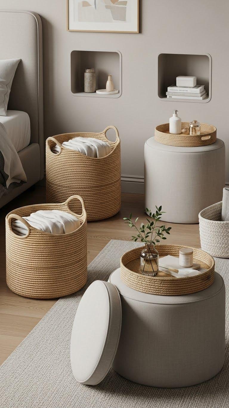 You’ll use rounded baskets for laundry and linens, tuck bedside items into recessed cubbies, and choose muted textures.