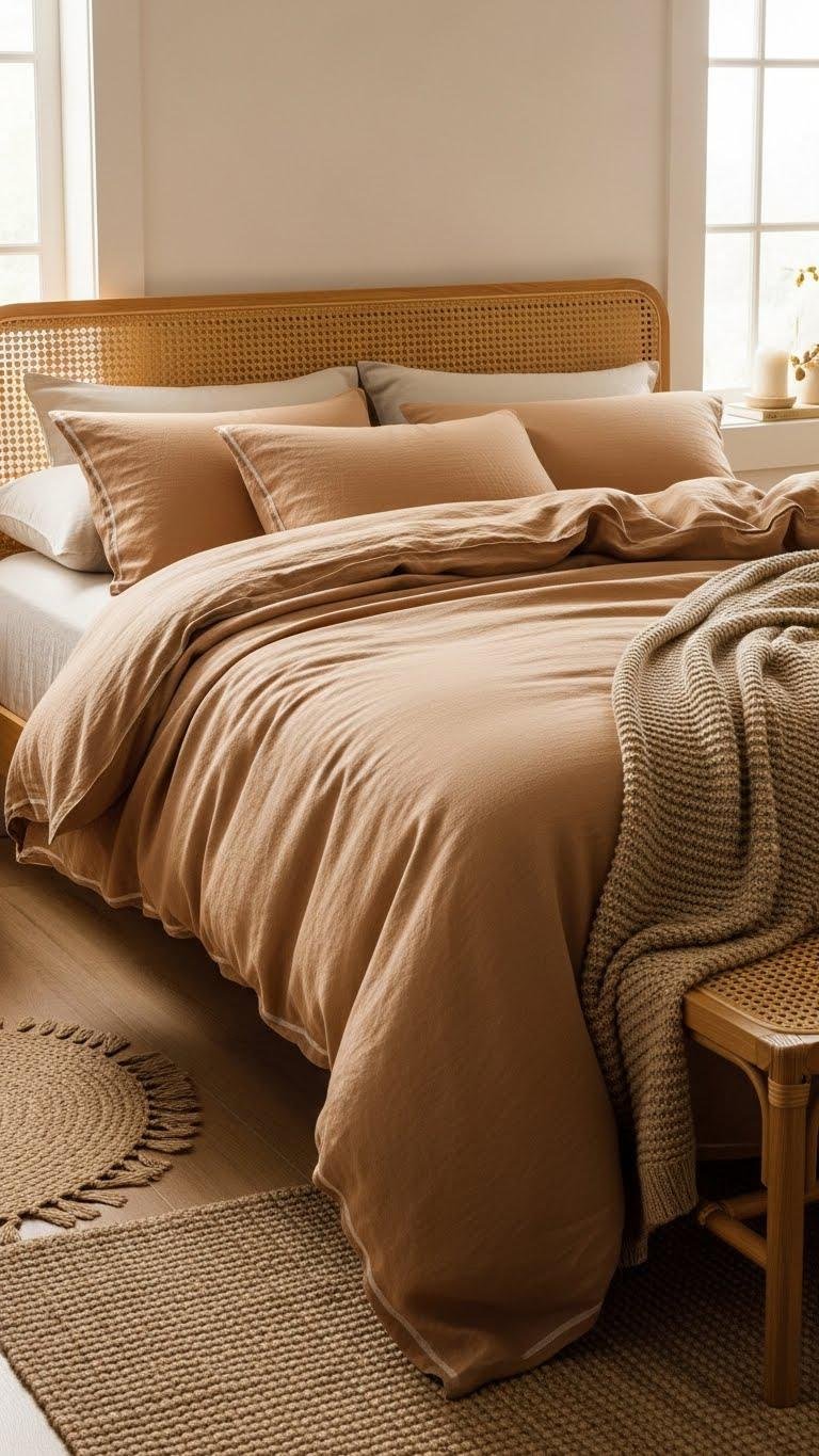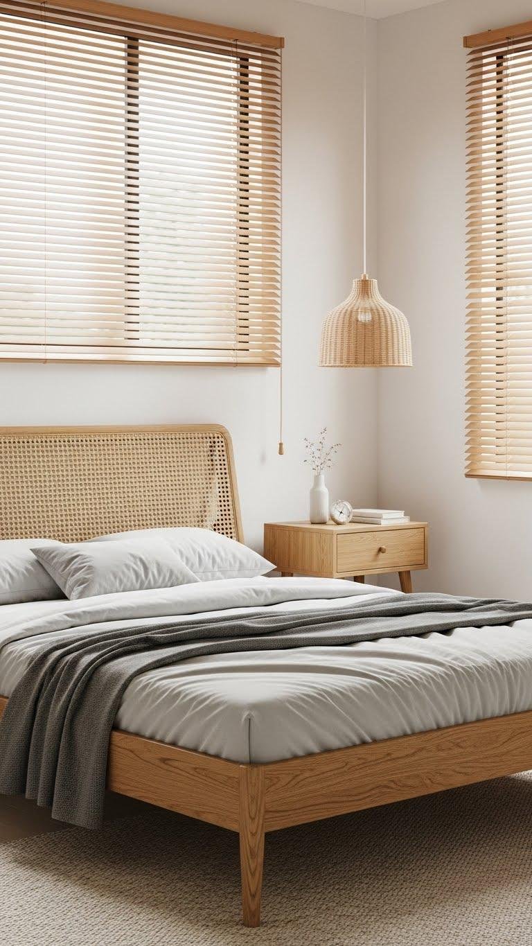 Pair a rattan headboard with a teak bedside, hang a wicker pendant, and fit bamboo blinds for filtered light—clean, airy, and unconfined.
