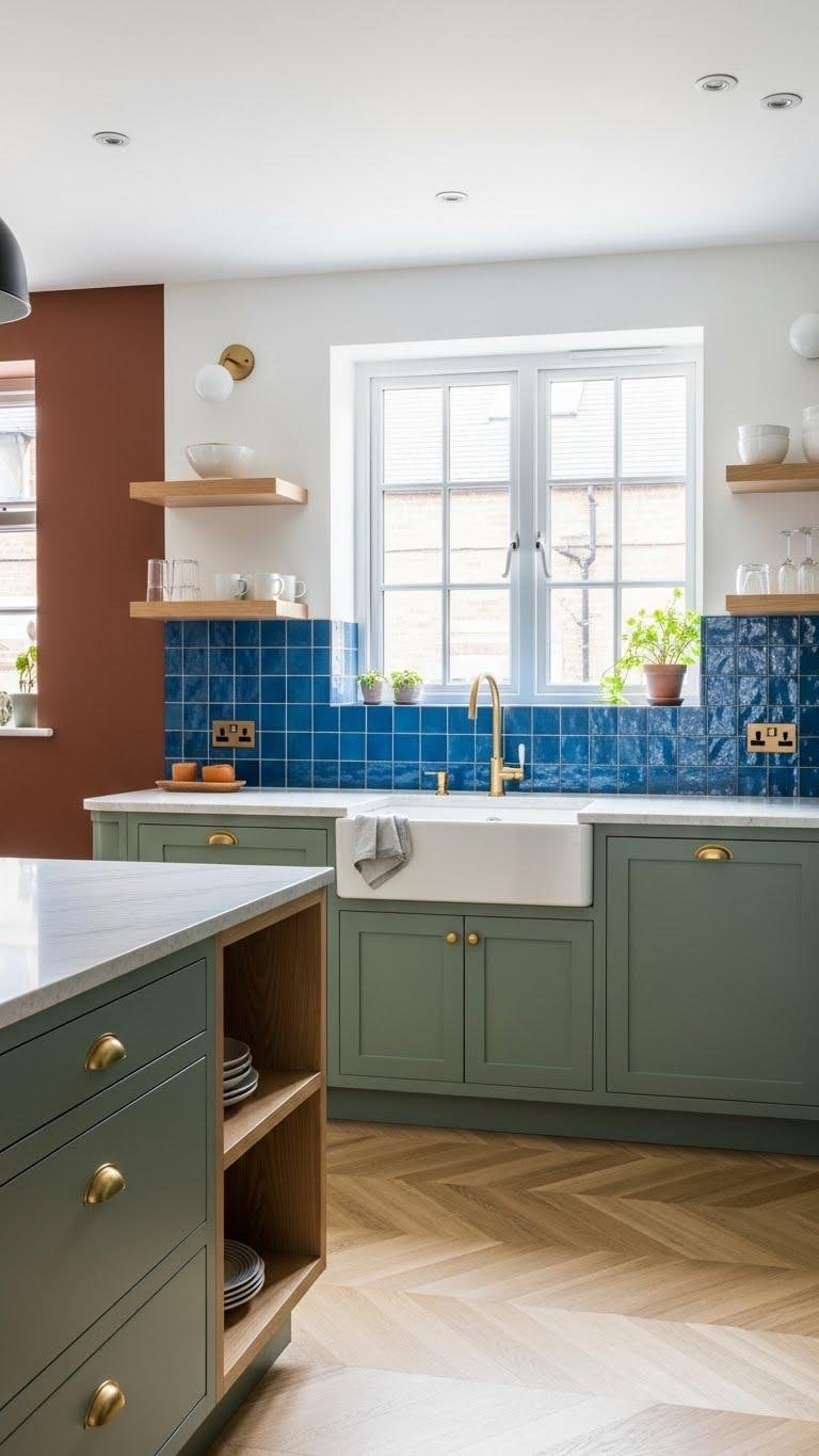 After grounding a living area with chocolate browns and terracotta warmth, bring that same comforting sensibility into the kitchen by pairing verdant greens with azure accents for a fresh, modern contrast. You’ll choose verdant cabinetry to anchor open shelving, matte brass hardware for warmth, and an azure backsplash to spark joy. Keep lines clean, light flowing, and finishes durable for liberated living.