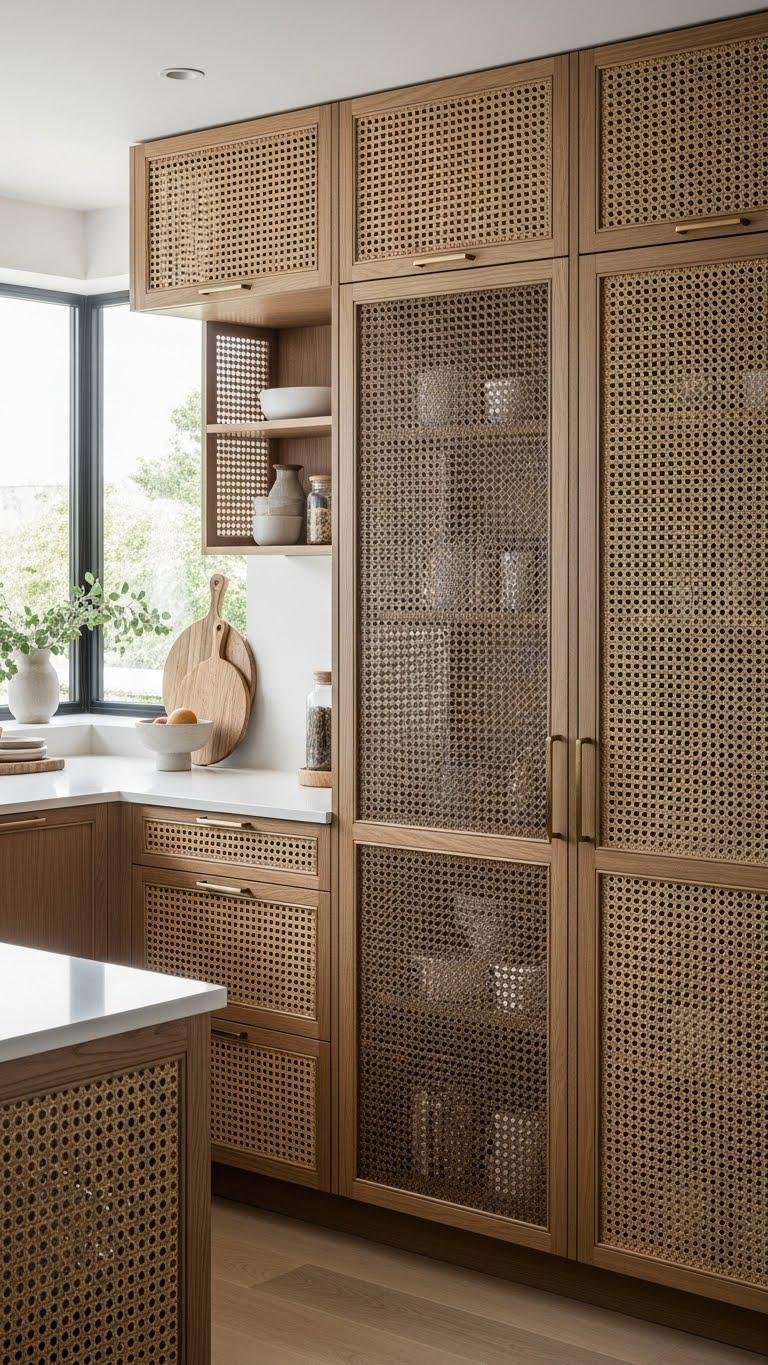 Woven-front cabinets and mesh-faced doors bring tactile warmth and breathable texture to modern storage, letting you soften hard lines without losing structure. You’ll mix woven fronts and mesh overlays to reveal glimpses of contents, add airy contrast, and keep spaces feeling open.