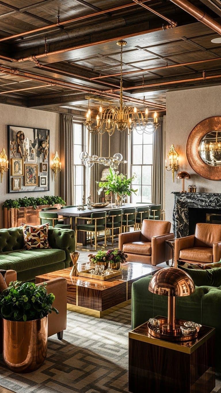Introduce flamboyant warm metallic accents to electrify a room with reflective color and bold personality. Let polished brass fixtures, mirror-like and unapologetic, punctuate shelving and lighting. Pair with copper patina surfaces for soulful depth and lived-in shimmer.