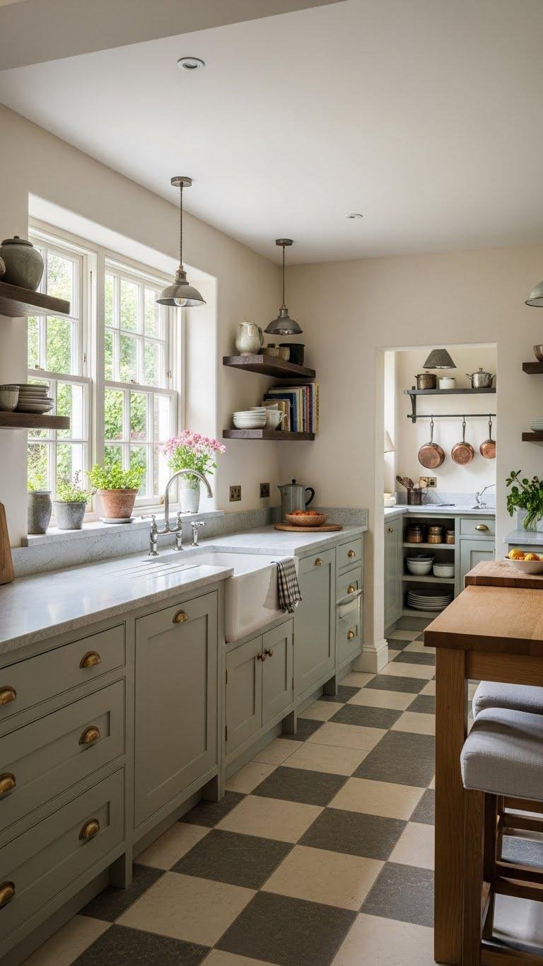 While the classic warmth of an English kitchen lingers in timber-paneled cabinetry and mullioned windows, you’ll update the look with modern textures—matte plaster walls, honed stone countertops, and brushed metal hardware—to keep it fresh and tactile.