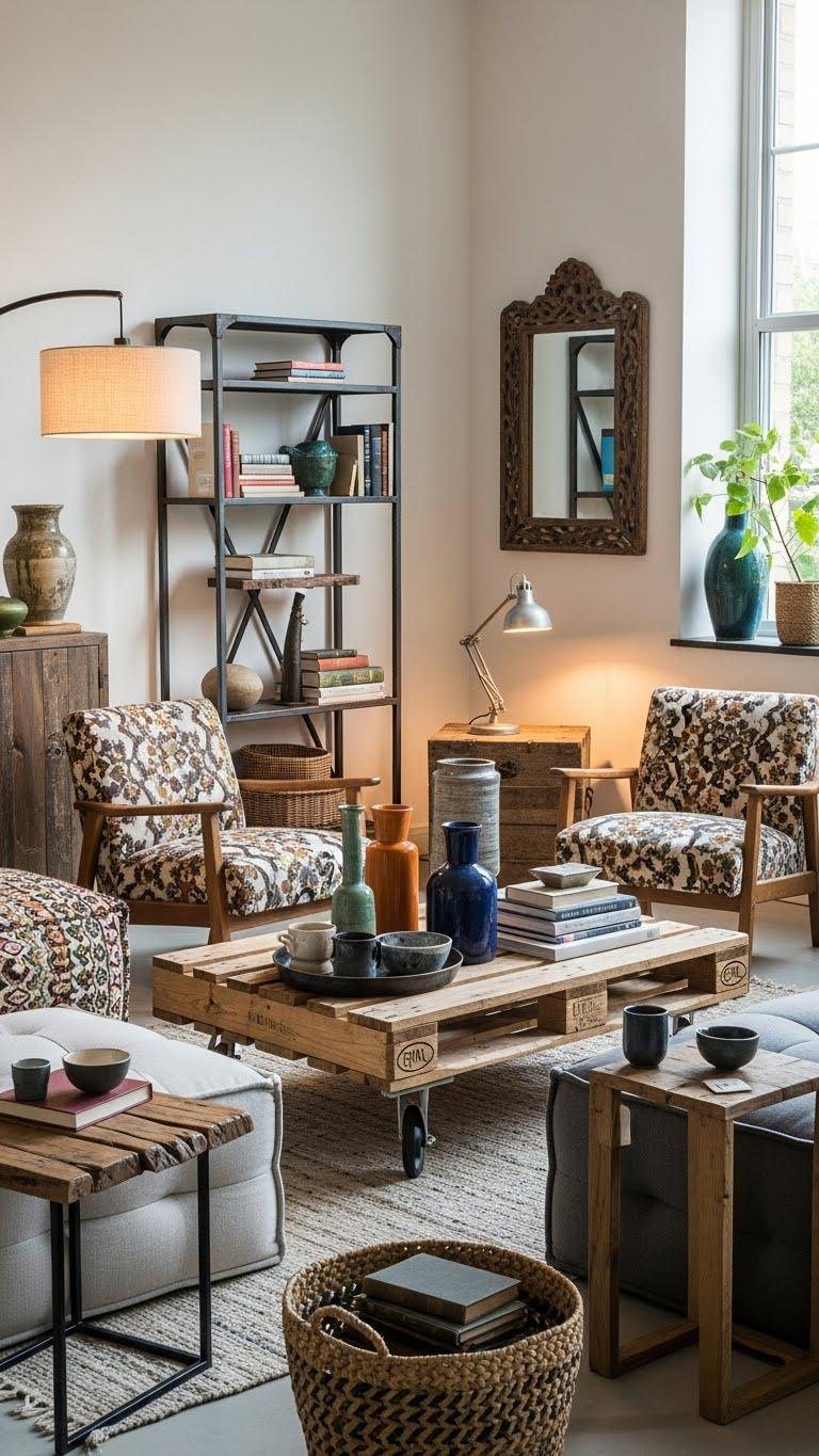 You’ll mix upcycled upholstery with bold textures, craft pallet tables as low-profile centers, and let mismatched finds feel intentional.