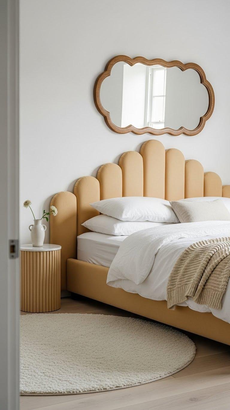 Scalloped silhouettes bring soft architecture to mirrors and headboards, turning functional surfaces into focal points that feel both vintage and modern. You’ll choose scalloped mirrors to reflect light with playful curves, or scalloped headboards to anchor a liberated bedroom aesthetic.
