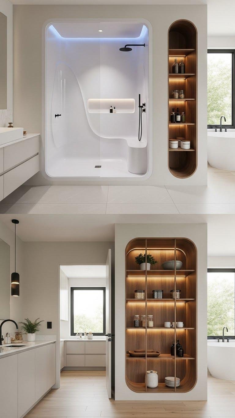 After soft curves in mirrors and headboards, carry that same rounded language into wet and work zones: alcove showers and rounded kitchen niches make everyday routines feel curated.
