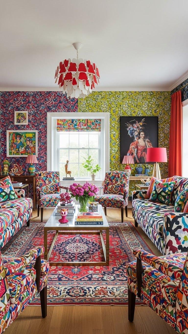 You’ll mix bold wallpapers with patterned upholstery, vivid rugs, and artful accents. Layer contrasting scales, repeat a palette to unify, and trust instinct. Don’t shy from clash—curated abundance lets your space breathe, feel alive, and reflect freedom.