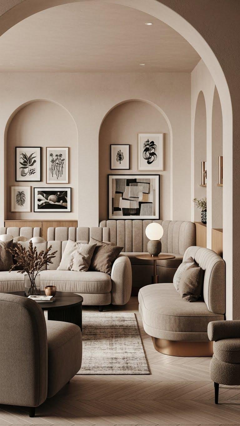 You’ll favor curved banquettes for lounging, plush sofas with rounded backs, and arch niches that frame art or cozy reading spots. These forms encourage relaxed movement, create intimate zones, and let you design a freeing, tactile home that feels both sculptural and lived-in.