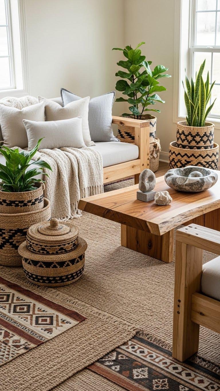 Bring in woven rugs, raw wood, linen, and stone to build a tactile palette that makes your room feel lived-in and intentional. Layer woven raffia baskets, raw hemp throws, and mixed-grain woods to add contrast and warmth.