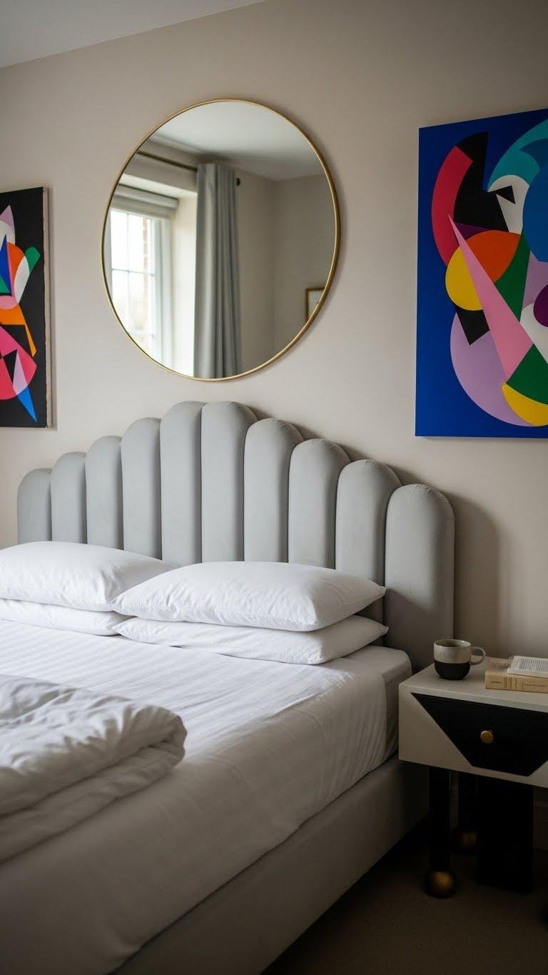 Alongside bold artwork, rounded mirrors and scalloped headboards soften a room’s geometry while adding instant personality—you’ll get curves that balance sharp angles and create a more inviting silhouette. Embrace rounded silhouettes to loosen rigid lines; pair a scalloped-texture headboard with minimal bedding.