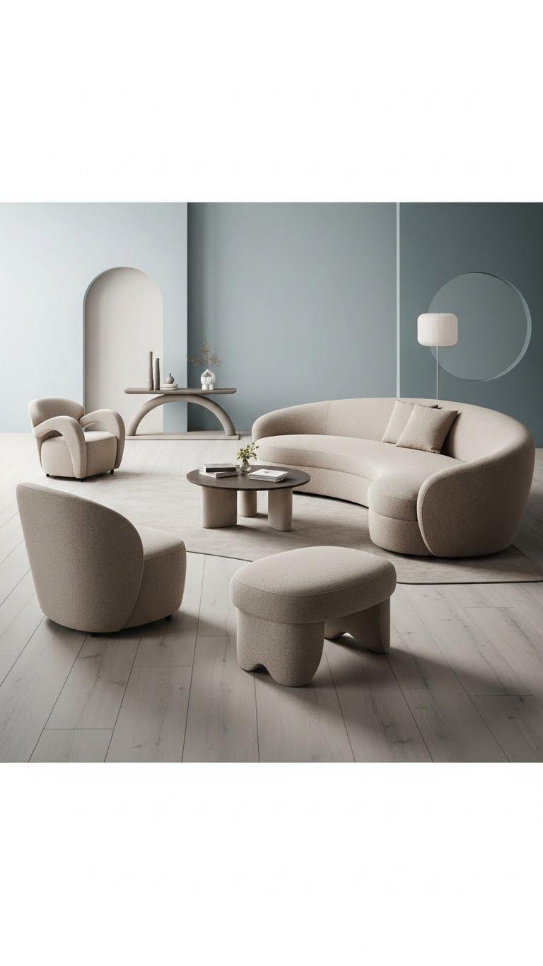 Mix low-profile curves with sculpted ottomans for contrast and tactile appeal. Keep finishes muted or bold where you want drama, but let the forms themselves create rhythm, ease, and a liberated living environment.