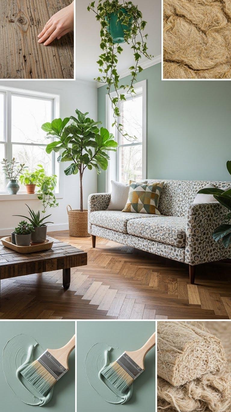 Choose finishes that withstand life — reclaimed wood, recycled textiles, low-VOC paints — and prioritize hemp insulation for breathability and longevity.