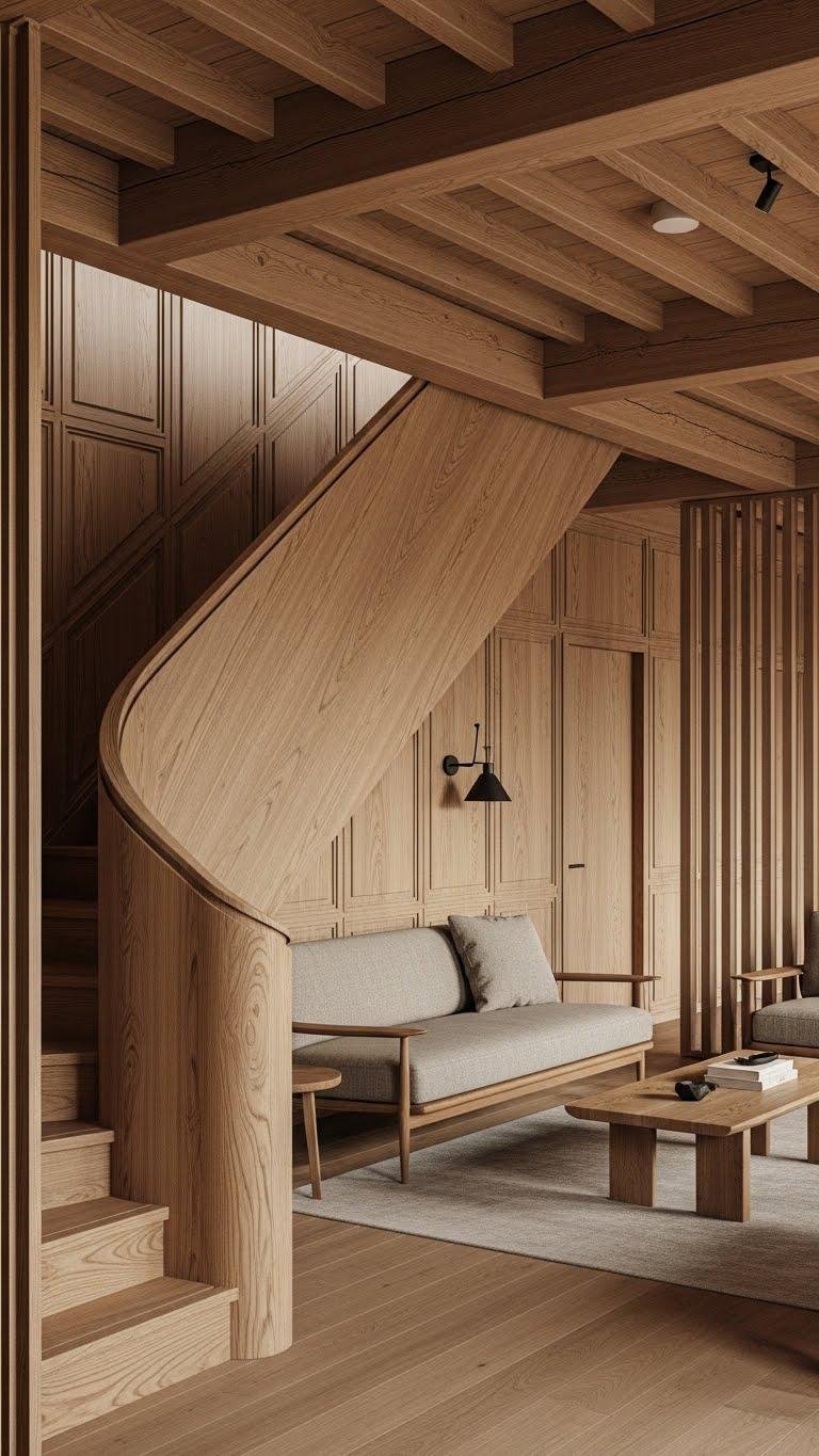 When you introduce wood-infused architectural details—think exposed beams, paneled walls, or a sculpted stair stringer—you give a room instant warmth, structure, and tactile depth.