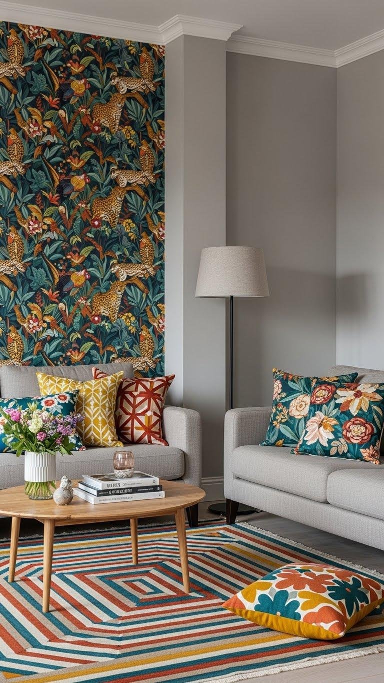 Start sparingly: introduce a bold print as an accent rather than the room’s whole personality, so it punctuates the space without overwhelming it. You’ll use statement scarves, pillows, or a single wallpapered panel for pattern punctuation.