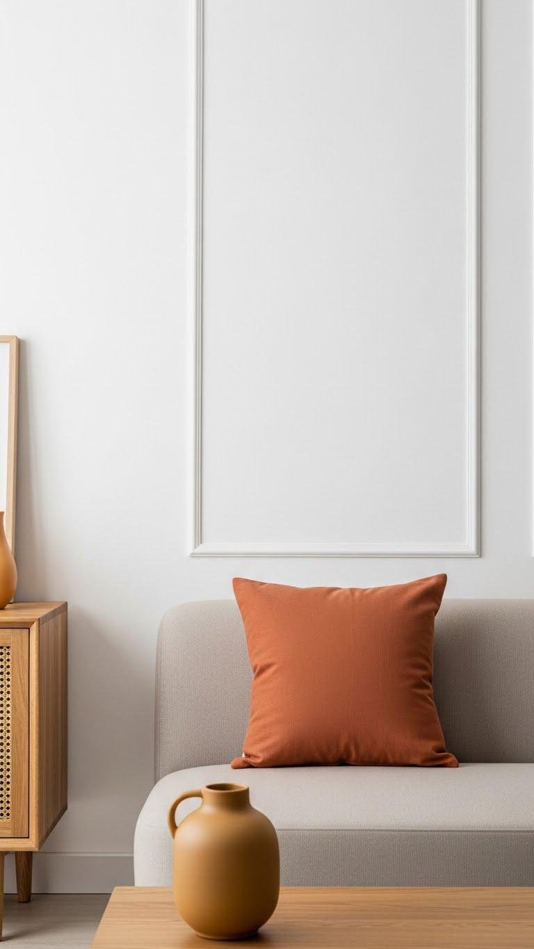 You choose one soft terracotta pillow or a muted ochre vase to ground the space.