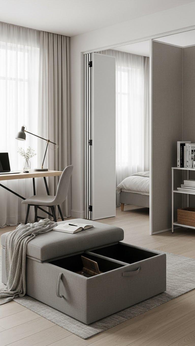 Soft, airy curtains set the tone for a calm room, and the furniture should support that same streamlined feeling. Choose a convertible ottoman for hidden storage and extra seating, and a folding partition to define zones when you need privacy. You’ll keep surfaces clear, move freely, and enjoy a pared-back space that adapts to work, rest, or guests without visual noise.