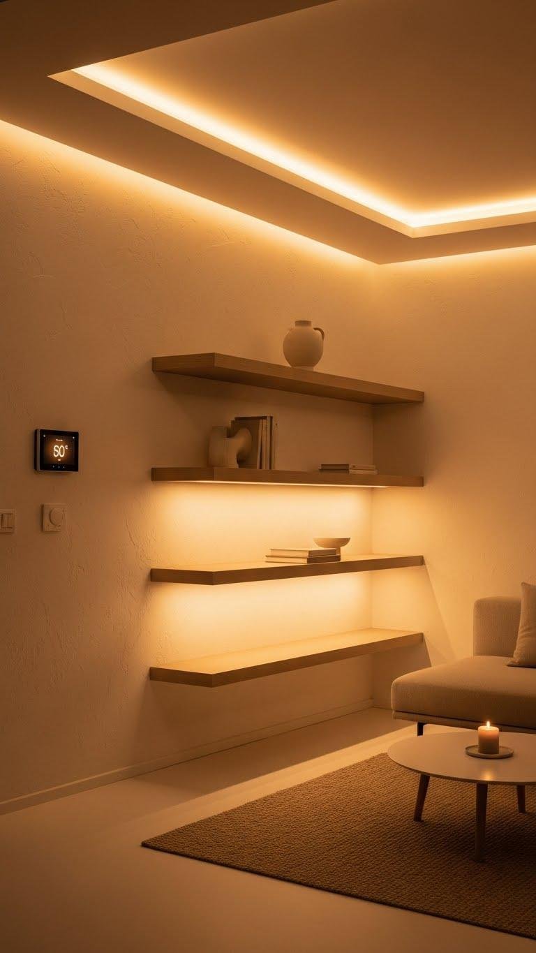 You can install dimmable LED strips under shelves or along coves to shape mood and focus.