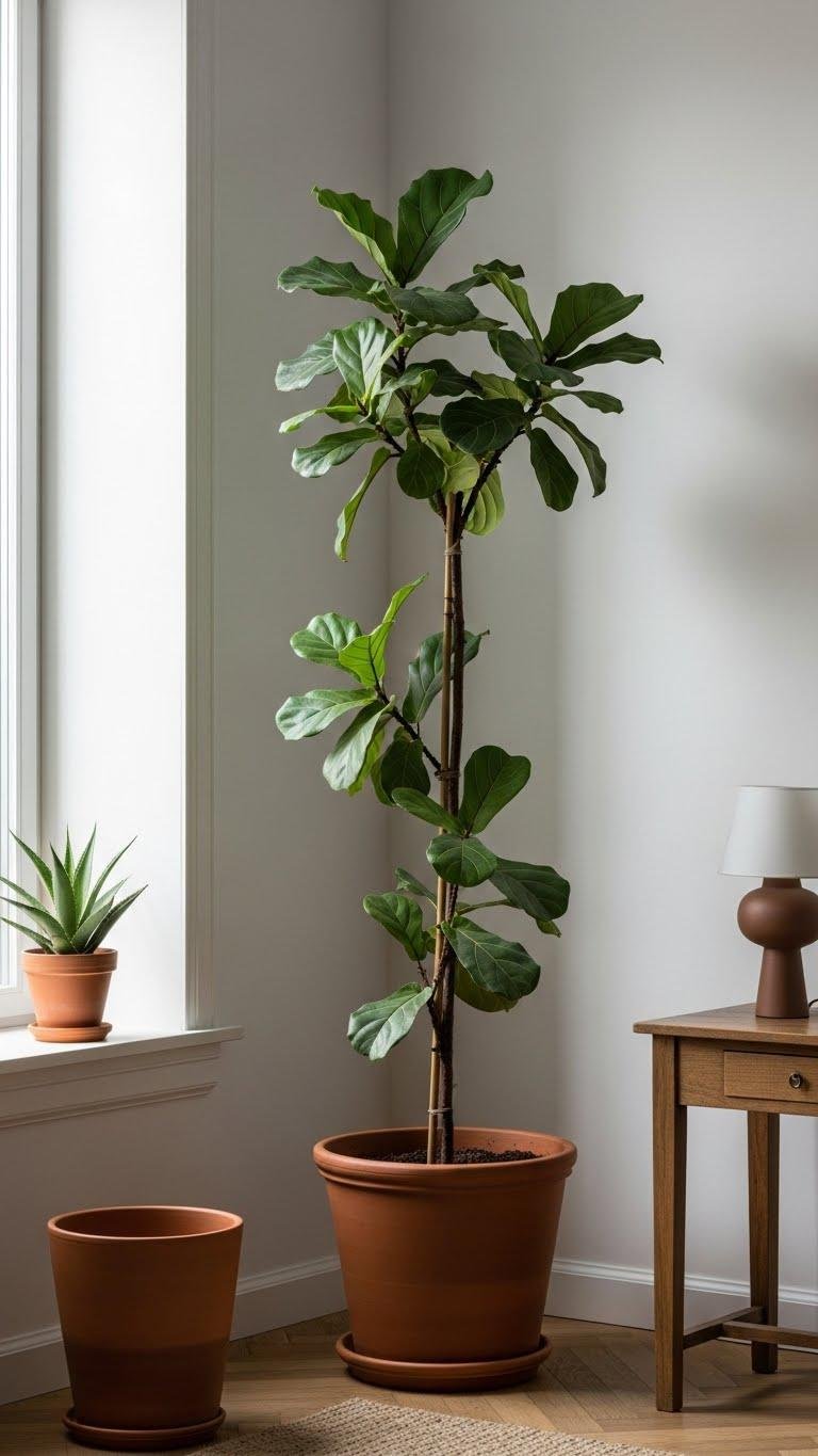 Bring a tall, architectural plant into the room to add form and movement without cluttering surfaces. You’ll choose sculptural pieces—architectural succulents or a sculpted fiddle leaf—paired with terracotta forms to ground the look.