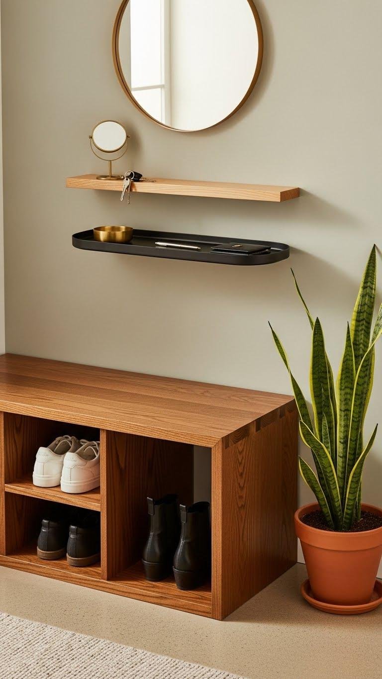 Set clear landing zones for daily items so you always know where keys, mail, and phones belong. You’ll place an entry bench near the door for shoes and quick sits, and set a slim catch all tray for tiny essentials.