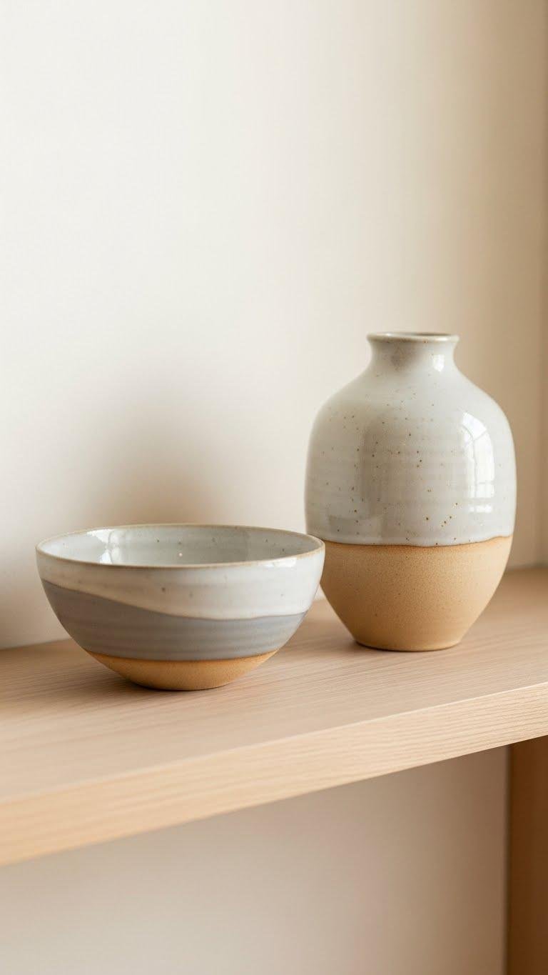 Bring handcrafted ceramics into your space to add quiet, tactile accents that ground a minimalist room. You’ll choose pieces with restrained shapes, natural tones, and handmade glazing that reads as calm texture.