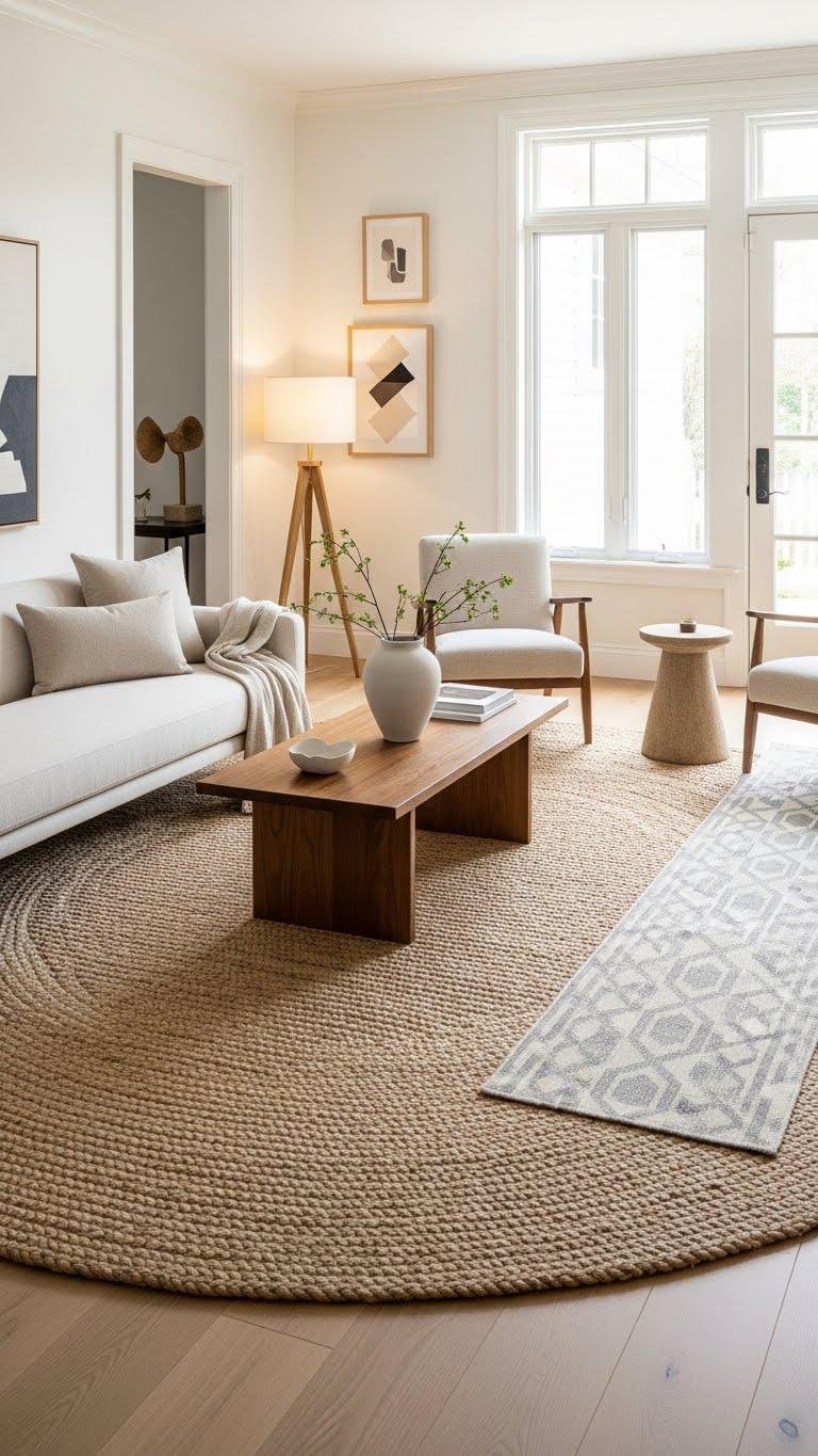 Choose an oversized sisal for natural texture or a subtle patterned runner to define flow.