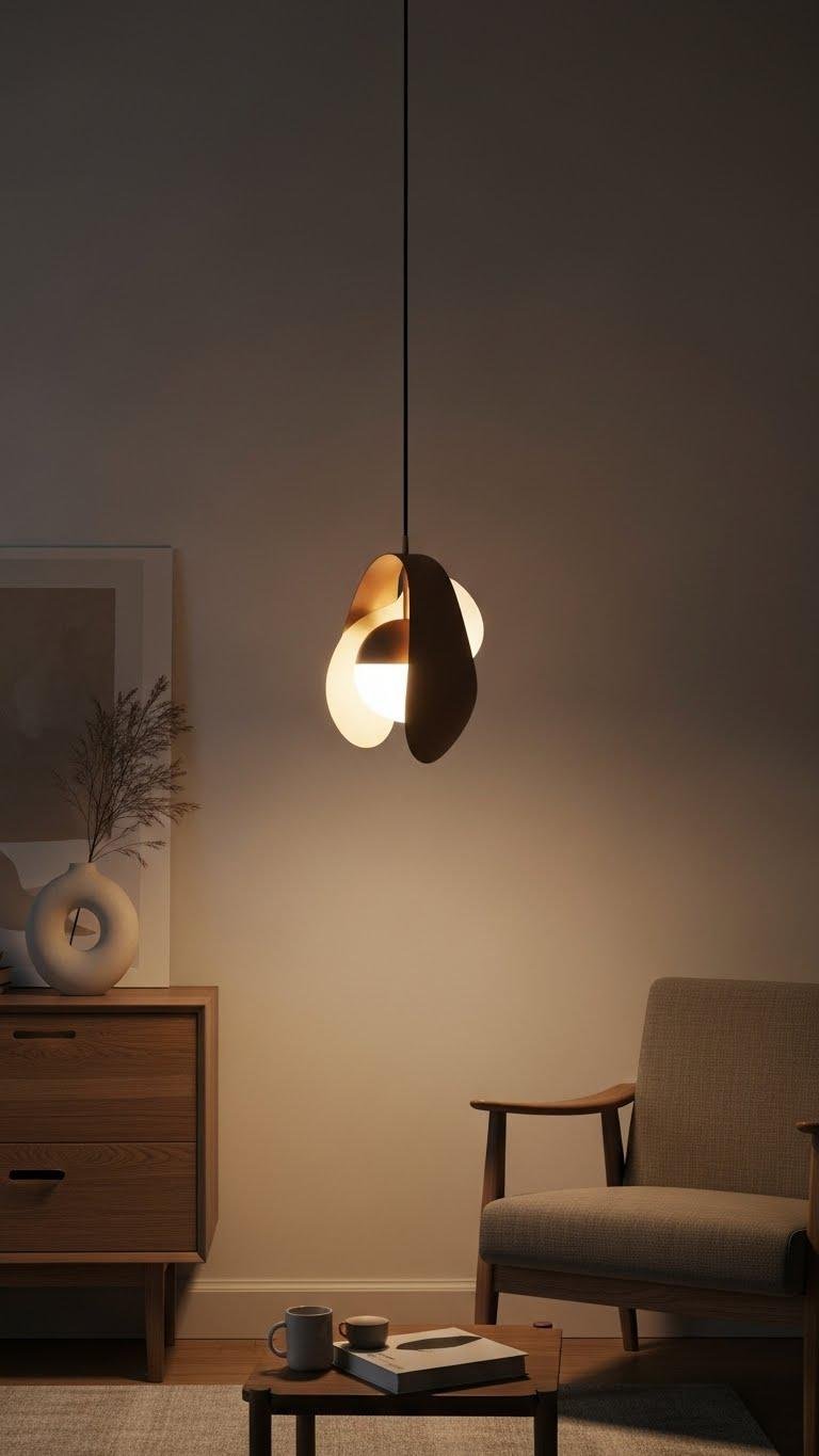 When you want a single, quiet anchor above the room that still reads as art, choose a sculptural pendant that complements the pared-back palette and proportions.