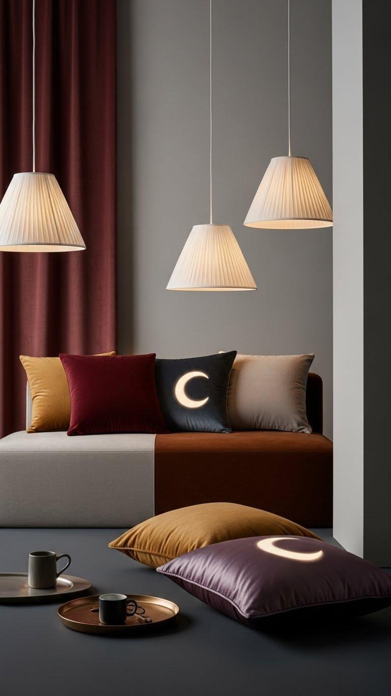 You’ll layer velvet matte textiles with subtle moonlit satin accents on cushions or lampshades, letting surfaces breathe.