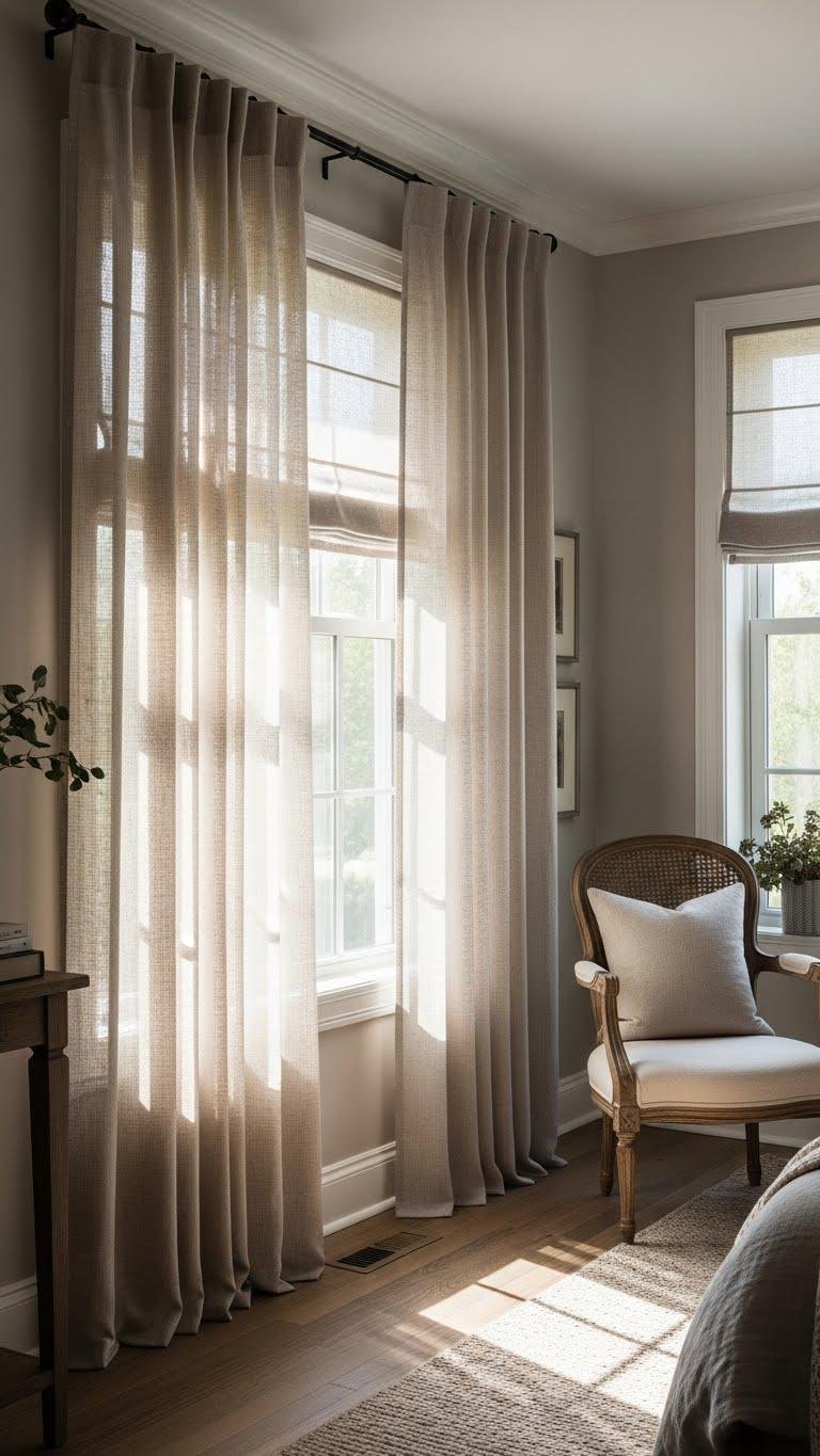 Linen drapery softens sunlight while preserving privacy, so you get bright, comfortable rooms without feeling exposed. You’ll choose neutral, breathable panels for sheer privacy that diffuse glare and keep views subtle.