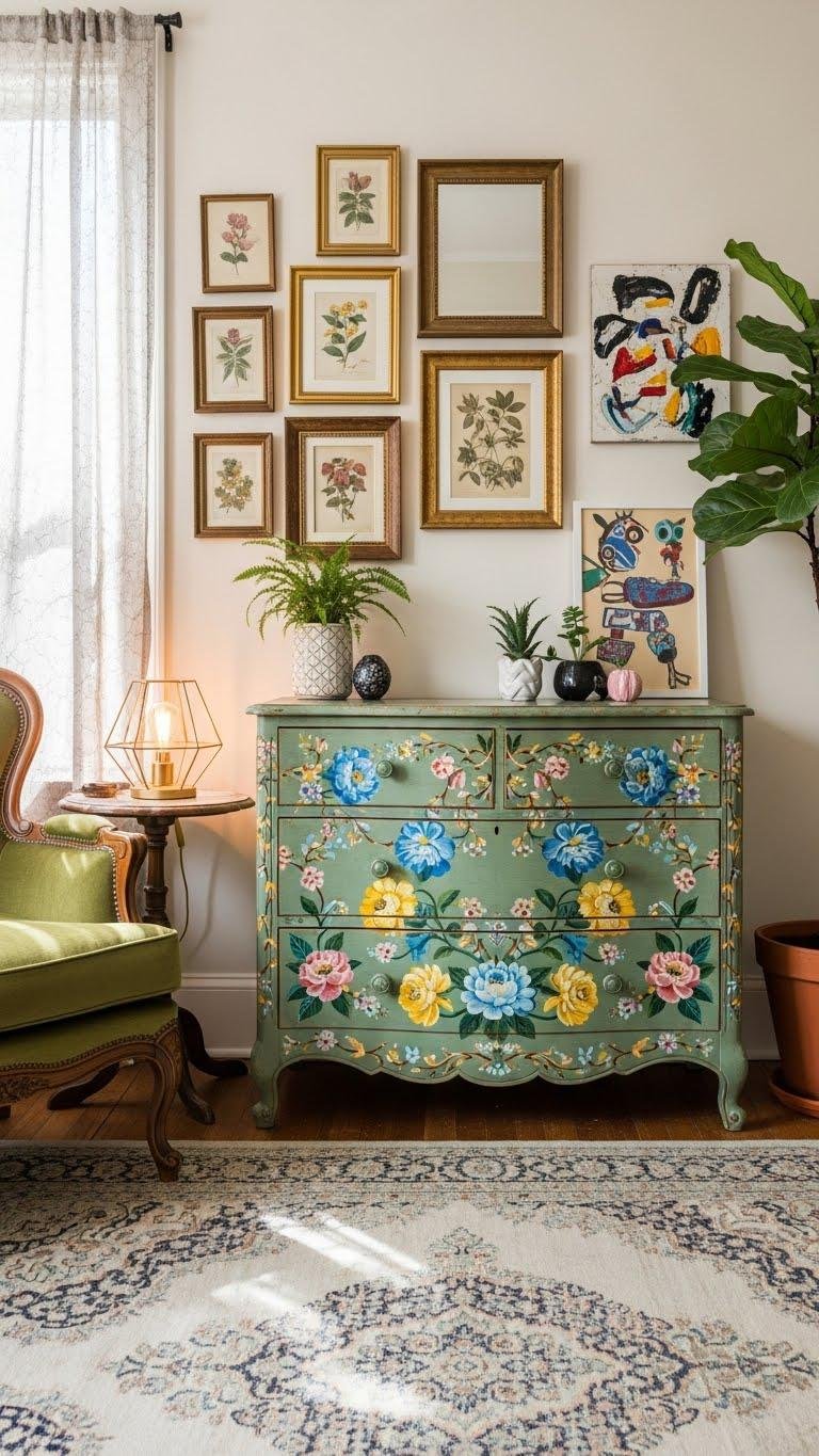 Bring a handpainted piece in to anchor the room and watch it transform—bold brushstrokes, trompe-l’œil details, or a soft patina turn ordinary furniture into a signature moment.