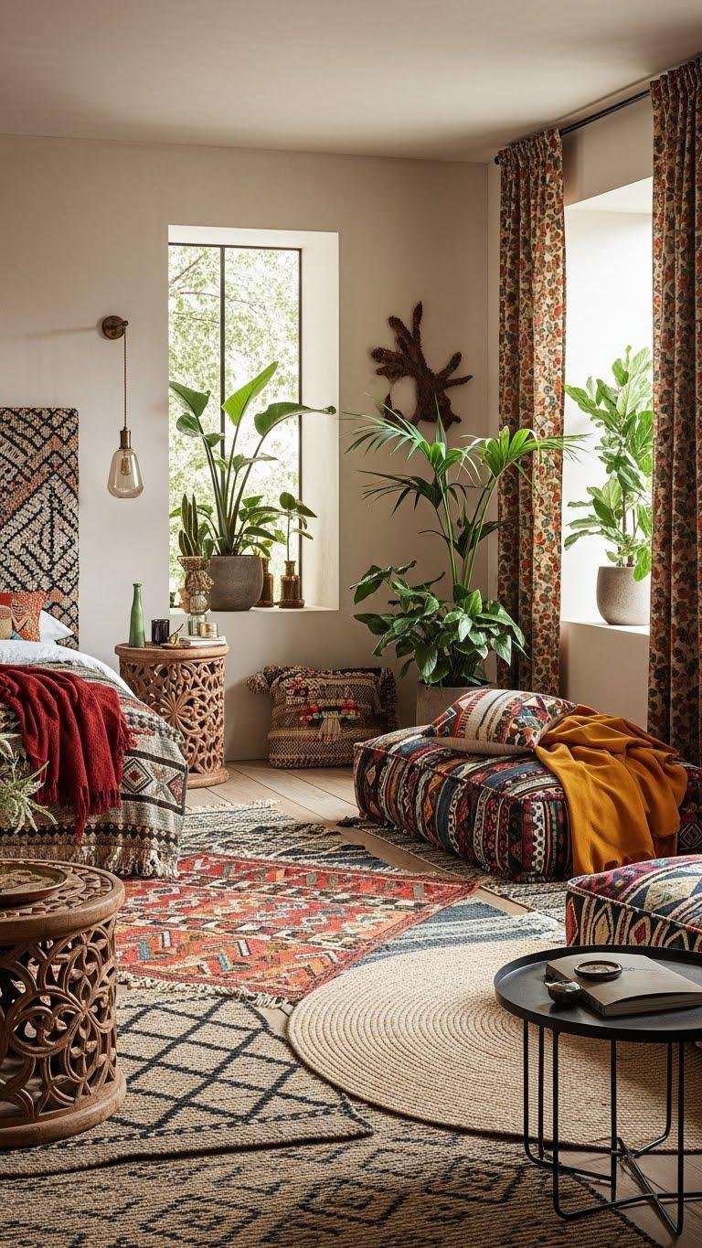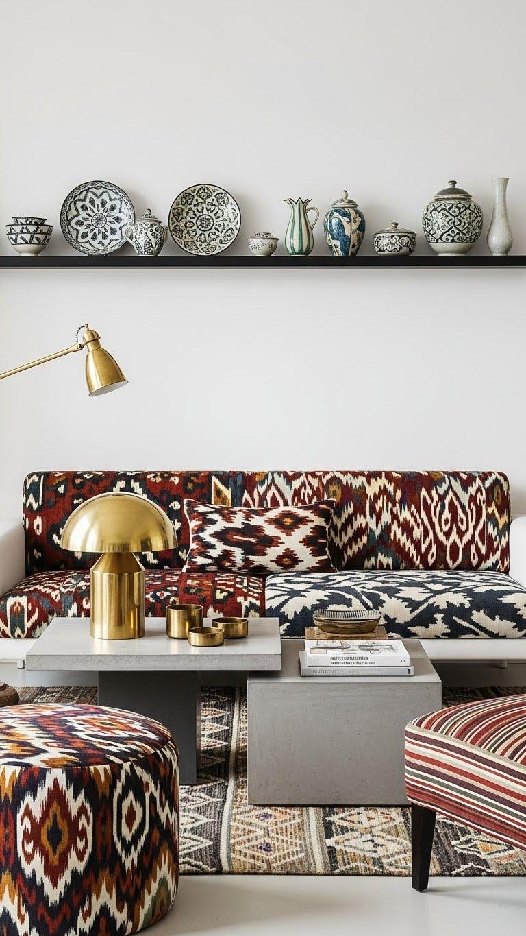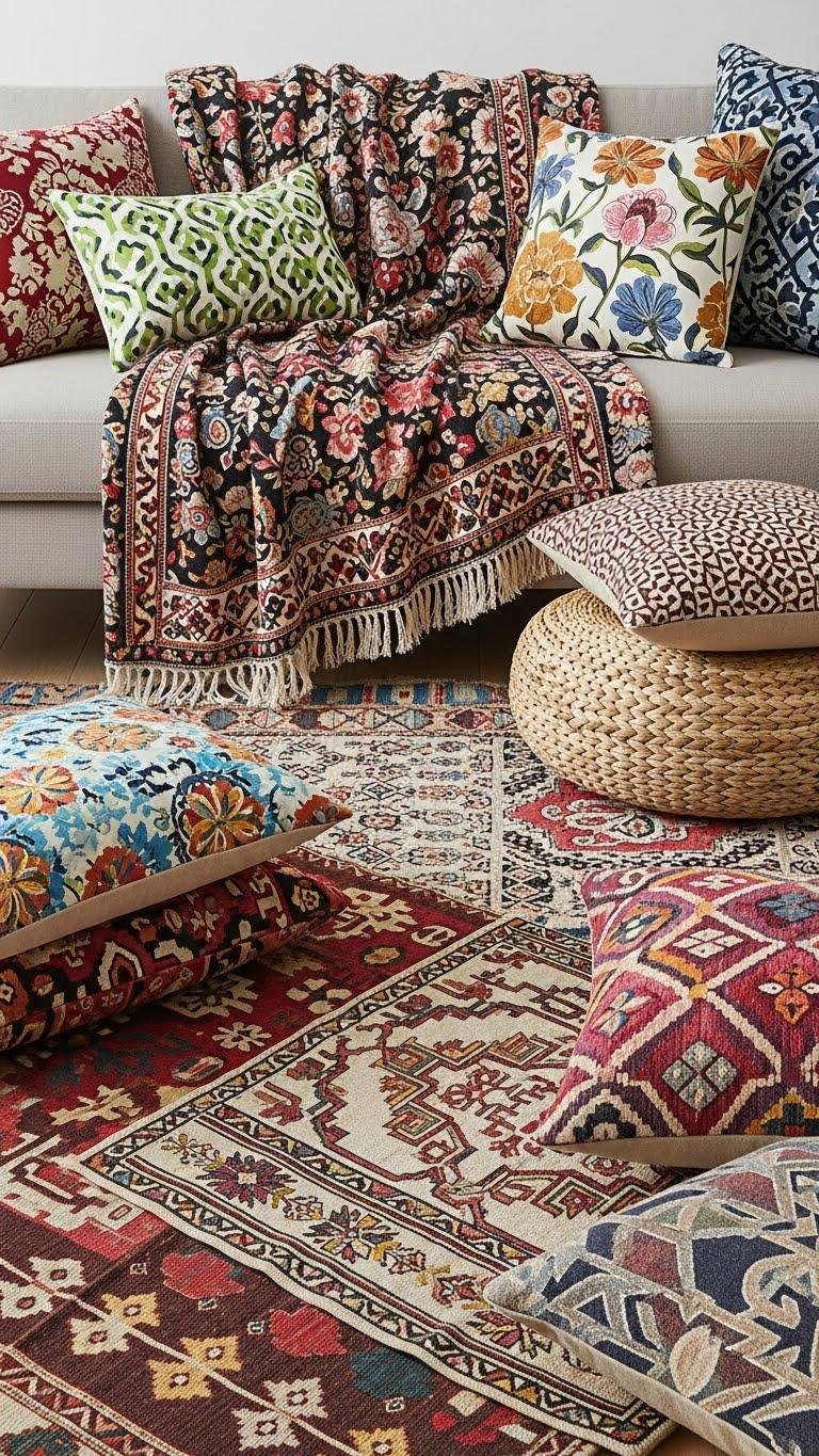 Often you’ll layer bold prints with confidence: start with a solid anchor (a neutral sofa or rug), then stack patterned throws, pillows, and a woven pouf in varying scales and palettes so each print reads distinct but related.