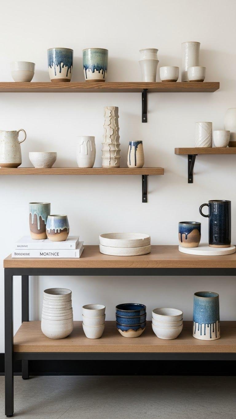 Display handmade ceramics where they can be seen and felt—on open shelves, floating ledges, or grouped on a console—so each piece reads like art.