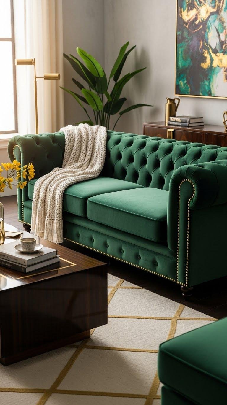 You’ll embrace velvet glamour that reads bold yet relaxed, mixing jewel tones with metallic accents. Tufted elegance adds sculptural rhythm; luxe texture invites lingering, stretches comfort, and frees your space to feel both polished and effortlessly alive.