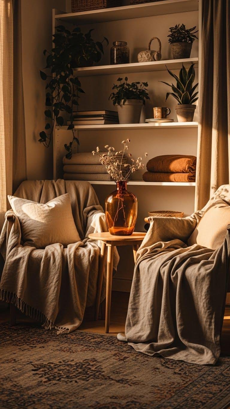 When you tuck a small corner into warm light and textured layers, it immediately reads like a lived-in memory—soft linen throws, amber glass, and a faded rug that hints at stories.