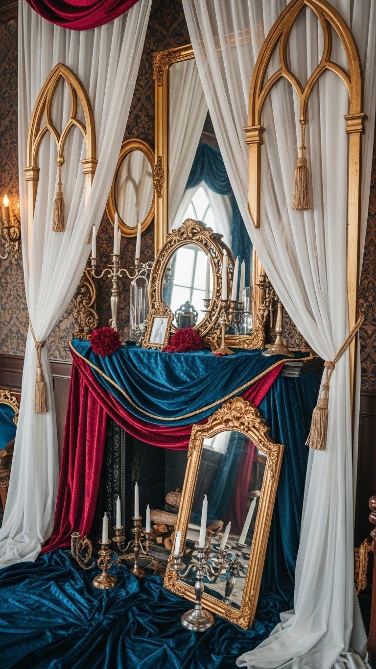 You’ll add a romantic gothic mantelscape with gilded mirrors, candlesticks, and velvet layers. Pair with cathedral inspired drapery in sheer jewel tones, arched hardware, and playful tassels.