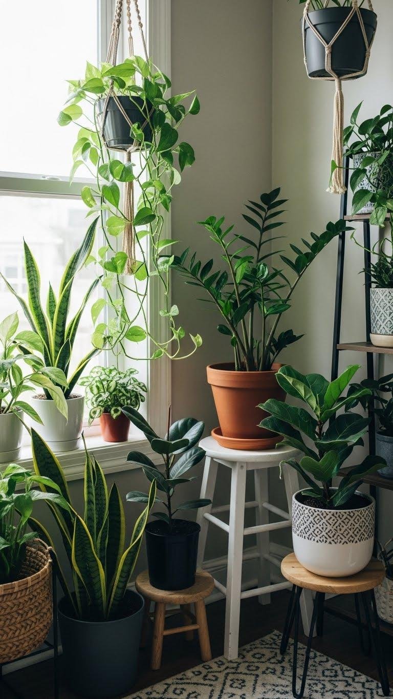 After carving out a luxe office corner, bring in living greenery to soften lines and boost focus. You’ll mix sculptural pots, hanging terrariums and trailing vines to create depth without clutter.