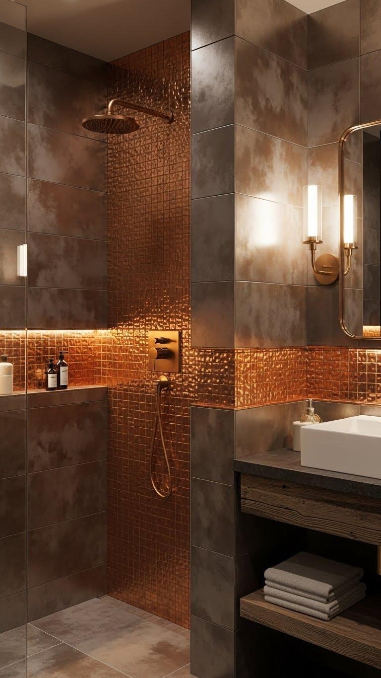 Think copper-tile bathrooms when you want warmth and instant luxe; the metal’s glow reads modern-retro and feels alive under soft lighting.