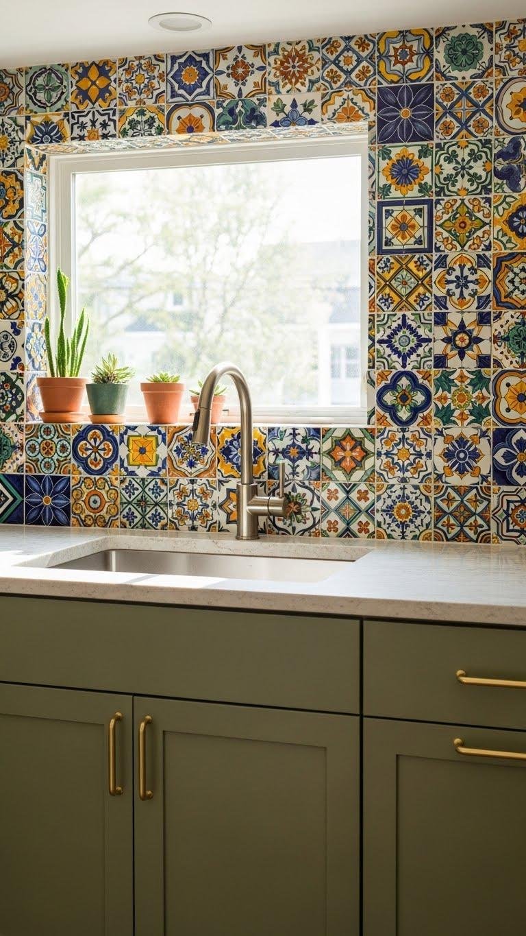 A vibrant Mexican-pattern backsplash injects instant personality into your kitchen, mixing bold tiles, hand-painted motifs, and geometric repeats that catch the eye and anchor the space.