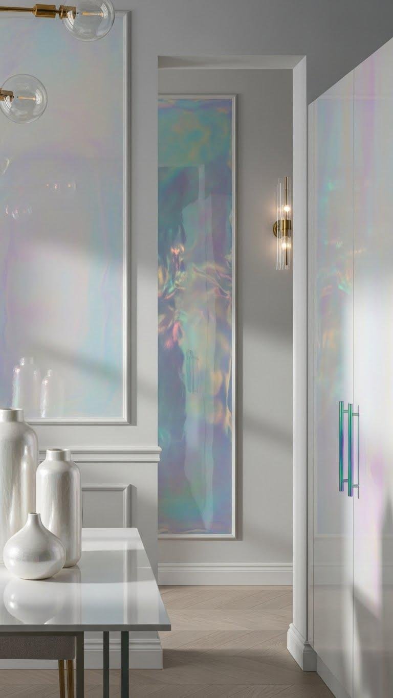 You’ll layer opalescent accents—pearlescent vases, translucent wall glaze—to catch sun and mood. Choose iridescent hardware for cabinets and lighting to add subtle movement. The effect feels liberating and calm, letting surfaces whisper color while you control bold statements elsewhere.