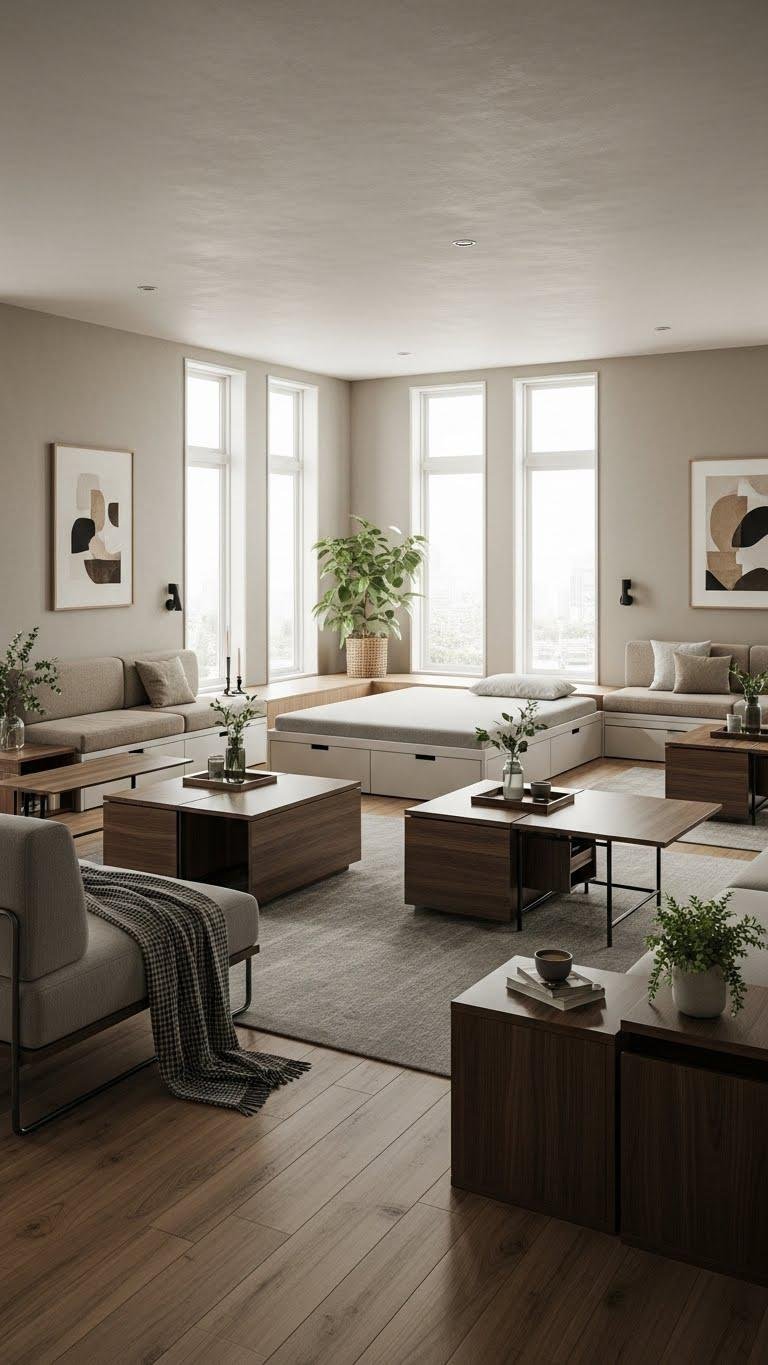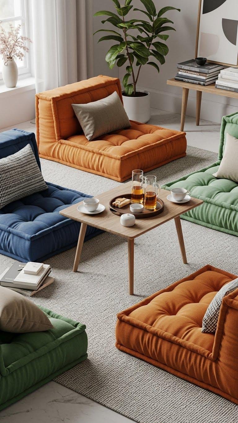 Mix modular cushions for lounging with compact tea tables for drinks and books, fostering relaxed, intentional living.