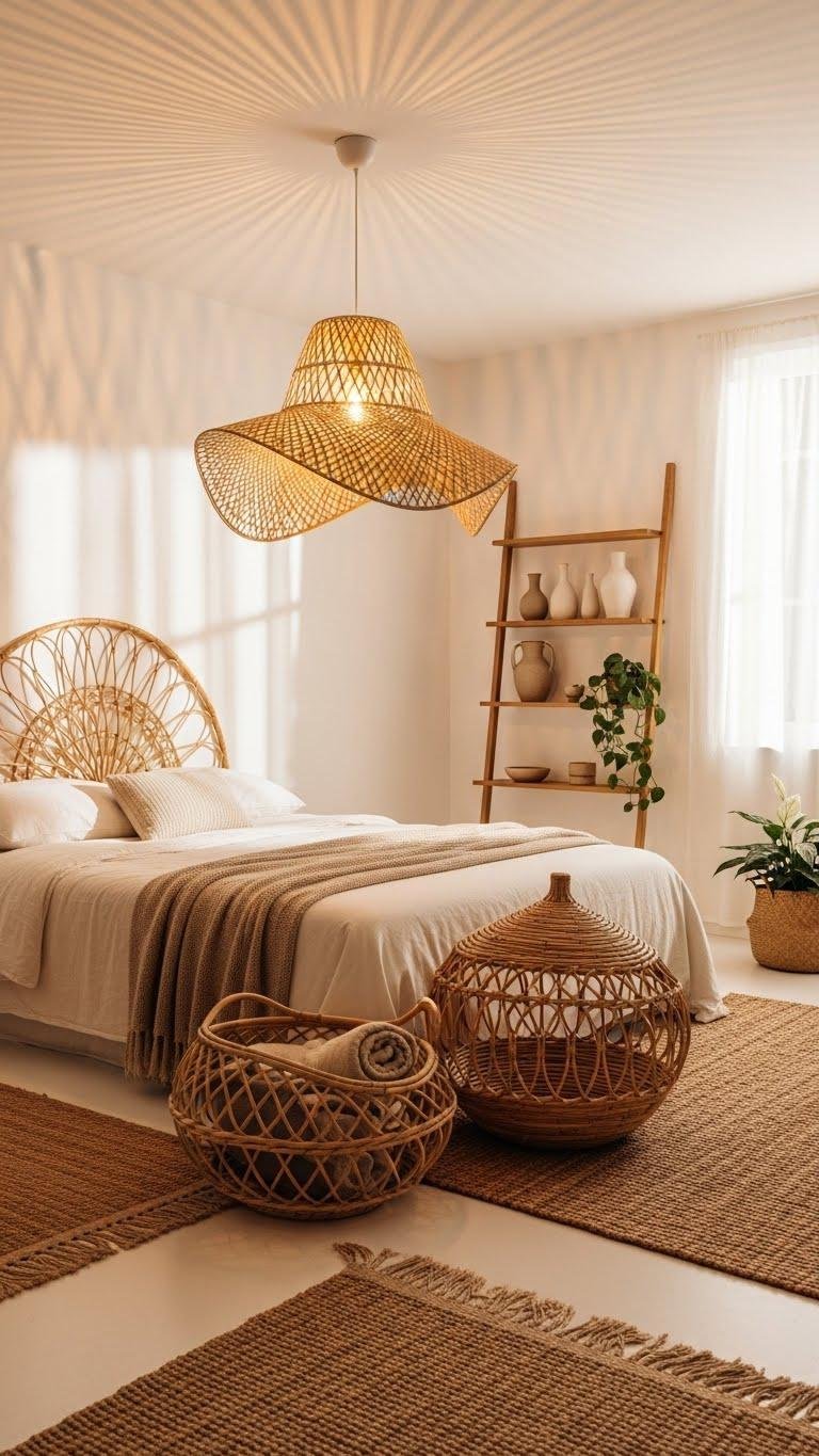 Choose rattan lighting to cast soft, natural shadows and pair it with a woven headboard for calm, tactile comfort.