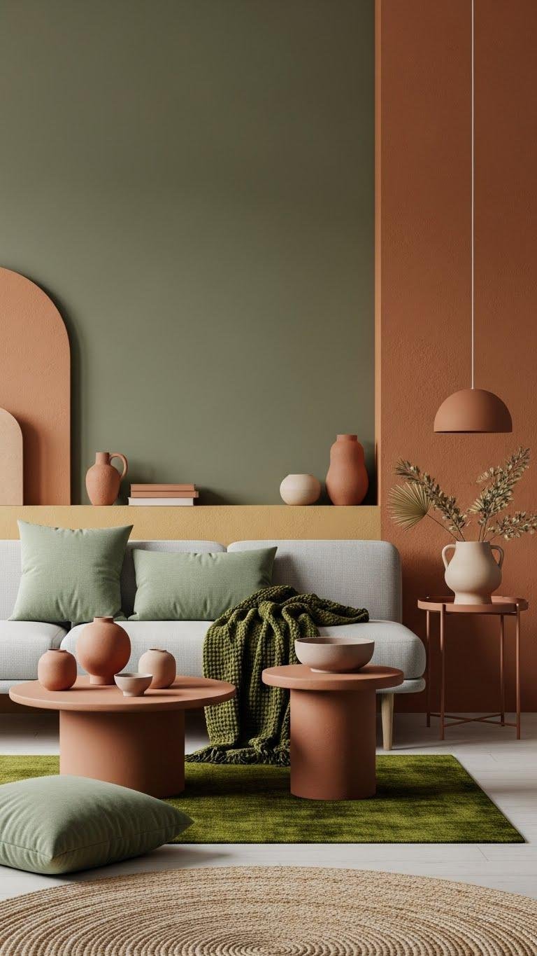 Try introducing a subdued olive or moss as your base accent and pair it with warm, earthy tones—terracotta, clay, and soft ochre—to ground the Japandi palette.