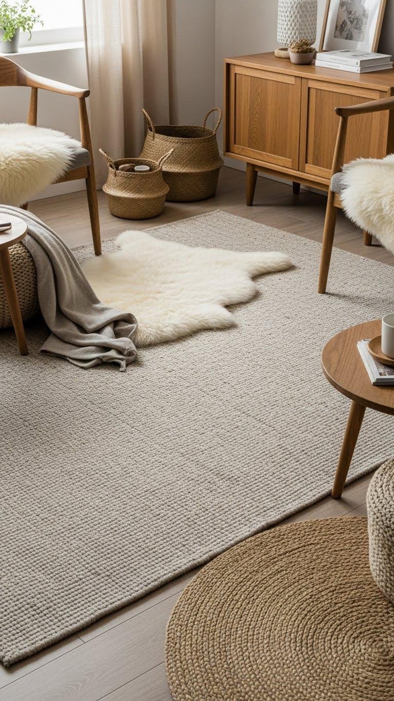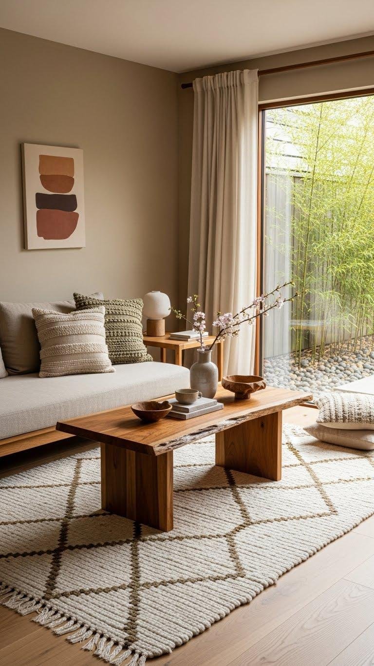 Often, a soft area rug quietly transforms a Japandi room, grounding furniture, muffling sound, and adding tactile warmth underfoot. Choose neutral, low-pile textures that let wood grain breathe.