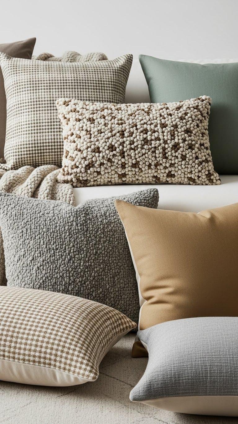 You’ll find that textured throw pillows in muted tones instantly deepen a Japandi scheme without cluttering it; pick linen, boucle, or soft wool in beige, dusty sage, or warm gray to add tactile warmth while keeping the palette restrained.