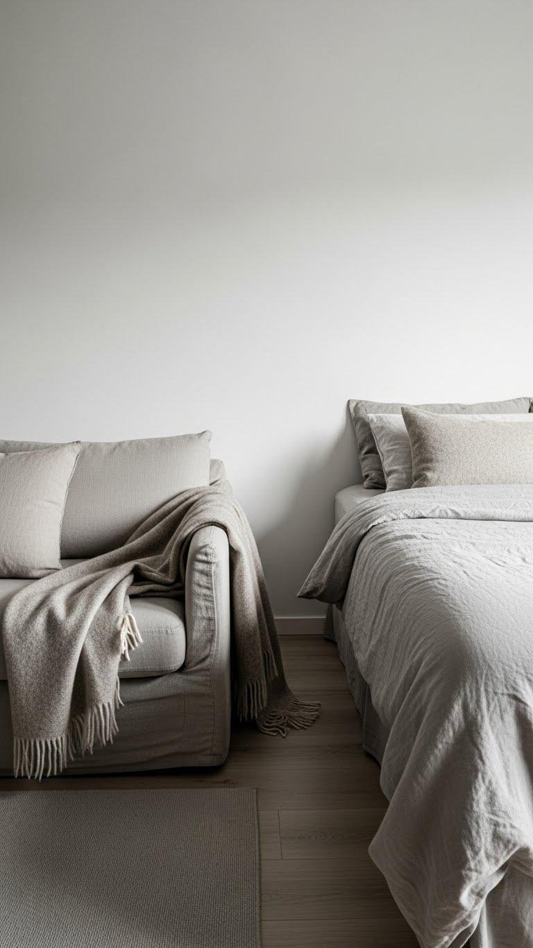 Often you’ll mix linen and wool to create a tactile, lived-in softness that still reads minimal. You’ll embrace linen layering on sofas and beds for airy calm, then add wool felting accents—throws, cushions, rugs—to deepen warmth and texture.