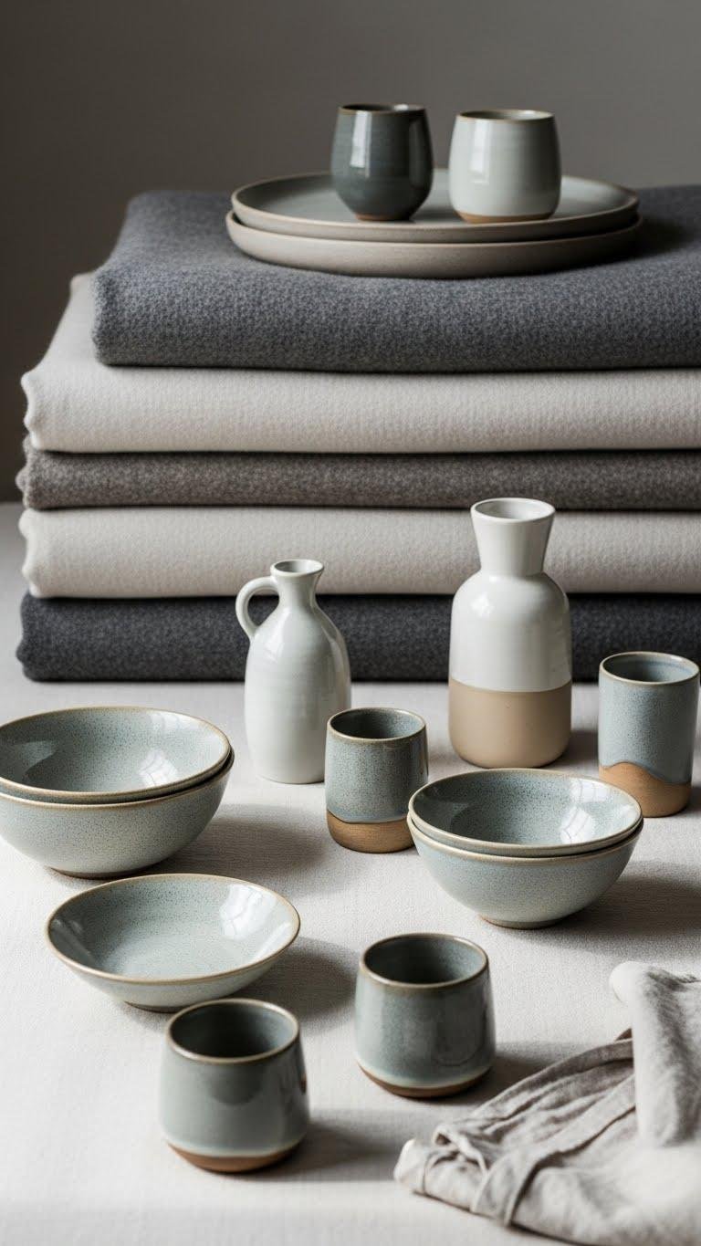 After layering linen and wool for tactile warmth, bring in simple, handcrafted ceramics to anchor surfaces and add quiet character. Choose pieces with a muted handmade glaze and organic forms that let light and space breathe. You’ll curate bowls, vases, and cups that feel lived-in yet deliberate.